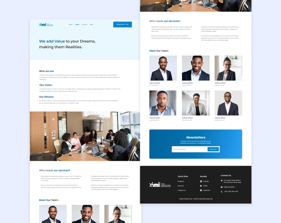 The about page provides in-depth information regarding the company's operations and services, as well as profiles of key team members.