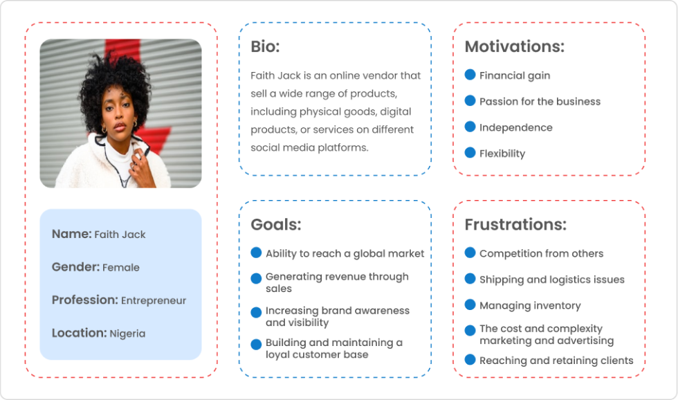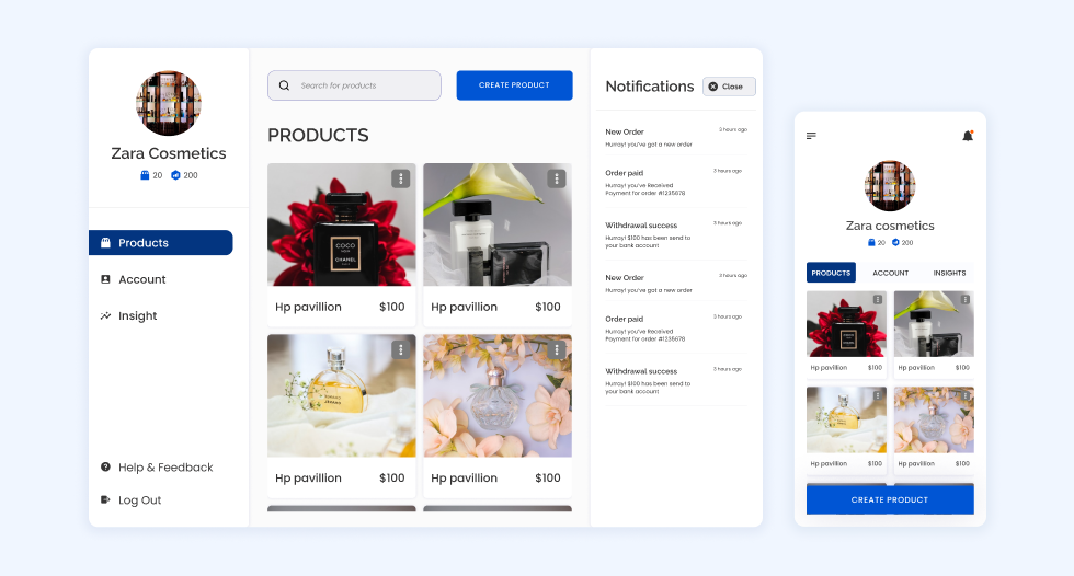 - Sell and share products: We want users to be able to sell products and share their links to customers using different means to gain a large audience.